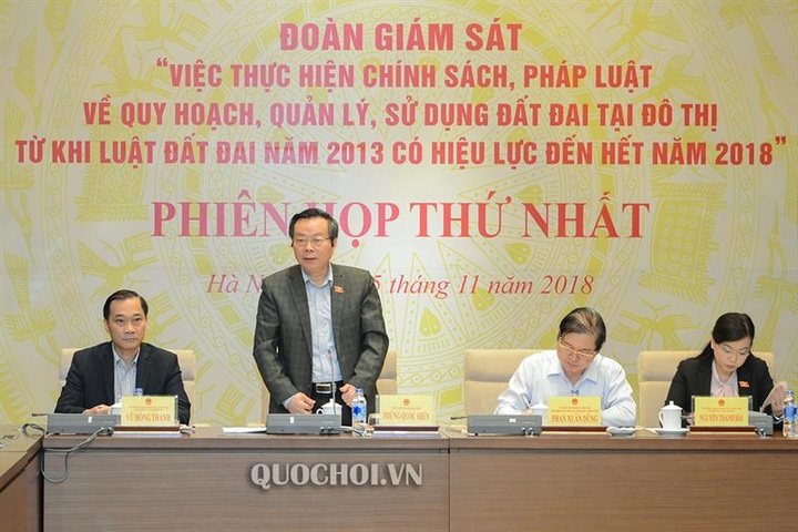 Tiếp đó, thay mặt Đoàn giám sát, Phó Chủ nhiệm Ủy ban Kinh tế của Quốc hội công bố Nghị quyết số 61/2018/QH14 Thành lập Đoàn giám sát “Việc thực hiện chính sách, pháp luật về quy hoạch, quản lý, sử dụng đất đai tại đô thị từ khi Luật Đất đai năm 2013 có hiệu lực đến hết năm 2018”. Theo đó, phân công: