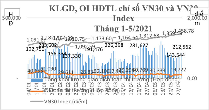 Khối lượng hợp đồng mở (OI) tại phiên giao dịch cuối tháng 5 đạt 26.969 hợp đồng, giảm 16,84% so với tháng trước. Mức OI cao nhất trong tháng 5 đạt 37.471 hợp đồng tại phiên giao dịch ngày 10/5/2021.