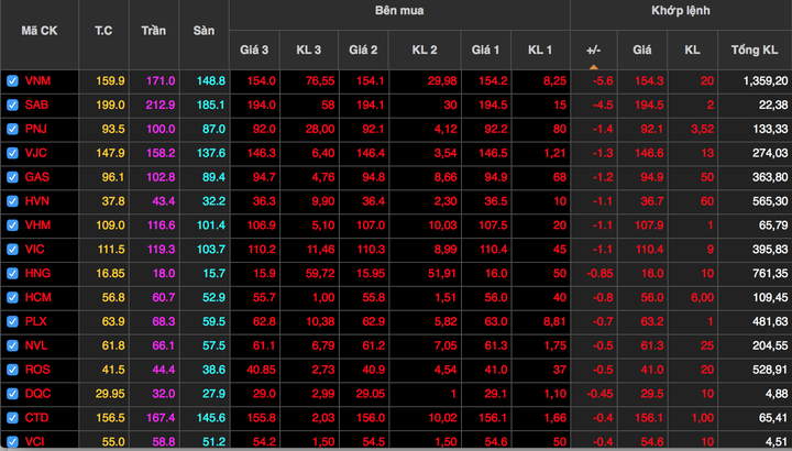 VNM và SAB tiếp tục dẫn đầu đà giảm: VNM mất 5.600 đồng, SAB mất 4.500 đồng. Bên cạnh đó, GAS cũng giảm 1.200 đồng, VHM và VIC cùng mất 1.100 đồng.