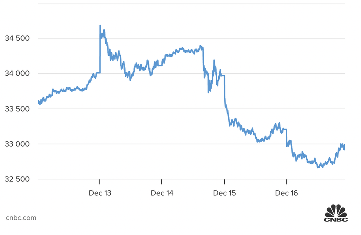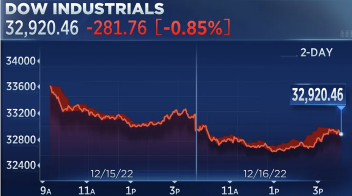 Chỉ số Dow Jones chốt phiên ngày 16/12 mất 281,76 điểm, tương đương 0,85%, xuống 32.920,46 điểm. Chỉ số S&P 500 giảm 1,11% xuống còn 3.852,36 điểm. Trong khi đó, chỉ số Nasdaq Composite thiên về công nghệ giảm 0,97% xuống 10.705,41 điểm.