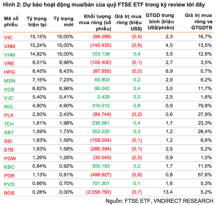 Nhóm phân tích ước tính VHM, VCB, TCH, SBT và NVL sẽ được FTSE ETF mua ròng mạnh trong khi ROS, VNM, PDR và VIC sẽ bị bán ra nhiều trong đợt review lần này.