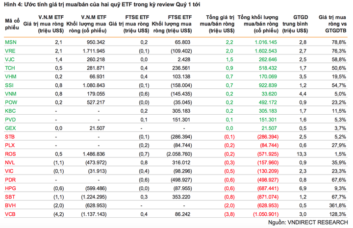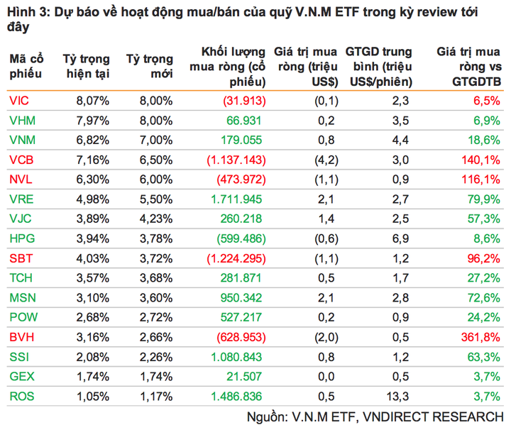 Đối với đợt cơ cấu lần này của V.N.M ETF, VNDirect cho rằng sẽ không có thay đổi nào trong danh sách các cổ phiếu Việt Nam có mặt trong danh mục MVIS Vietnam Index. Đồng thời, dự báo tỷ trọng các cổ phiếu Việt Nam trong MVIS Vietnam Index sẽ giữ nguyên ở mức hiện tại là 70,54% tổng giá trị danh mục.