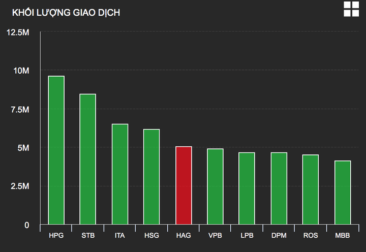 HPG đang là mã được giao dịch sôi động nhất với khối lượng khớp lệnh đạt 9,62 triệu đơn vị. Kế đến là STB với 8,46 triệu cổ phiếu giao dịch; ITA khớp 6,52 triệu cổ phiếu; HSG khớp 6,19 triệu cổ phiếu.