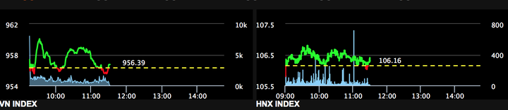 Nhìn vào đồ thị diễn biến của chỉ số chính VN-Index có thể thấy trong phiên sáng nay, thị trường đã rung lắc mạnh. Có tới 3 đợt tăng rồi lại giảm mạnh. Dù vậy, VN-Index vẫn đạt được mức tăng nhẹ 0,33% tương ứng 0,03% lên 956,72 điểm.