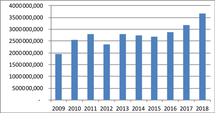 Biểu đồ 1: Số lượng HĐTL TPCP được giao dịch giai đoạn 2009- 2018 (đơn vị: hợp đồng. Nguồn: FIA)