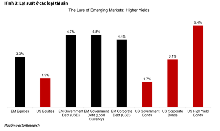 Chuyên gia VDSC lập luận rằng sự đối lập này là những gì đã xảy ra ở thị trường chứng khoán châu Á trong năm nay. Dòng tiền yếu chảy vào các thị trường mới nổi, nhìn chung ảm đạm, lặp lại thực tế là thị trường thanh khoản lớn hưởng lợi từ sự phục hồi nhanh hơn nhiều so với các thị trường nhỏ, ít thanh khoản hơn. Do đó, thị trường vốn ở các nước phát triển đã thu hút gần 122 tỷ USD (3,1% AUM) trong khi các thị trường mới nổi bị rút ra 31 tỷ USD (6,7% AUM) năm 2020. Mặc dù lợi suất ở thị trường mới nổi cao hơn nhiều so với các loại tài sản khác (Hình 3). |