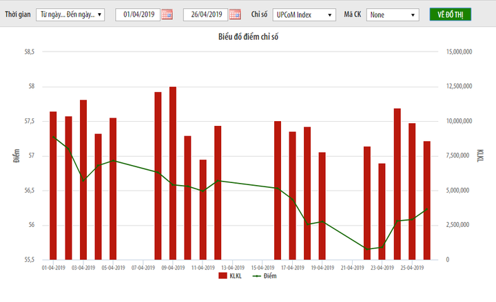 Thị trường diễn biến theo chiều hướng giảm dần và chỉ số UPCoM-Index giảm xuống mức thấp nhất vào ngày 22/4, sau đó bắt đầu tăng trở lại.