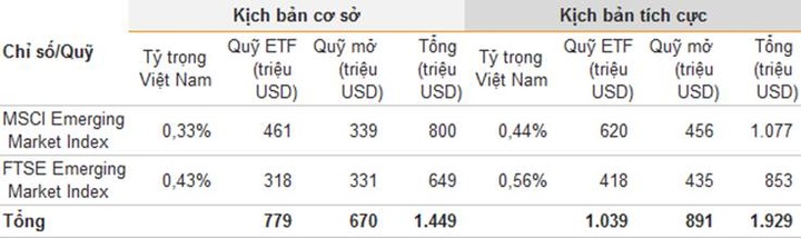 VNDirect cũng ước tính, thị trường chứng khoán Việt Nam có thể hút dòng vốn ngoại lên tới 1,4 tỷ đến 1,9 tỷ USD nhờ được nâng hạng lên thị trường mới nổi, trong đó 779 triệu USD đến 1.039 triệu USD sẽ đến từ các quỹ ETF mô phỏng theo Chỉ số thị trường mới nổi của MSCI và Chỉ số thị trường mới nổi của FTSE; và 670 triệu đến 891 triệu USD từ các quỹ đầu tư chủ động đang tìm kiếm cơ hội đầu tư vào các thị trường mới nổi.