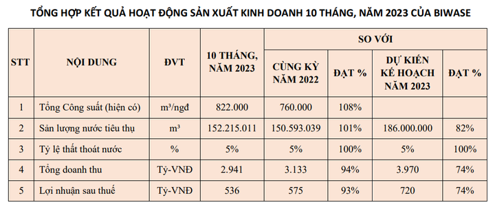 Nước Thủ Dầu Một công bố 10 tháng, doanh thu hơn 495 tỷ đồng, lợi nhuận hơn 254 tỷ đồng, tăng lần lượt 20% và 41% so với cùng kỳ. So với kế hoạch năm, công ty thực hiện 77% mục tiêu doanh thu và 85% mục tiêu lợi nhuận.