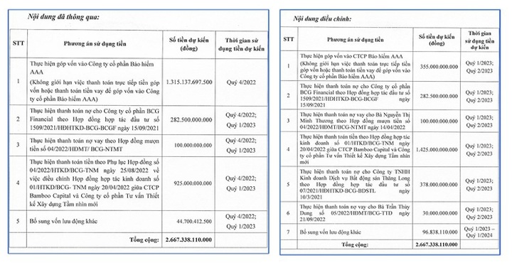 Kế hoạch chào bán giữ nguyên song phương án sử dụng đã được thay đổi. Bamboo Capital thông báo giảm số tiền góp vốn vào Bảo hiểm AAA chỉ còn 355 tỷ đồng, giảm gần 1.000 tỷ đồng so với kế hoạch ban đầu góp đến 1.315 tỷ đồng, đồng thời lùi thời gian góp vốn sang nửa đầu năm 2023 thay vì cuối năm nay.