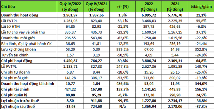 Chi phí hoạt động quý IV/2022 tăng gần 90% so với cùng kỳ và ở mức 1.451 tỷ đồng, trong đó, lỗ từ FVTPL là 1.139 tỷ đồng, gấp 3,5 lần cùng kỳ. Công ty có khoản chi phí dự phòng các khoản phải thu khó đòi, lỗ suy giảm tài sản tài chính và chi phí đi vay của các khoản cho vay là 108 tỷ đồng, gấp 3,4 lần quý IV/2021. Chi phí tài chính tăng mạnh từ 168 tỷ đồng lên mức 424 tỷ đồng, gấp 6 lần.
