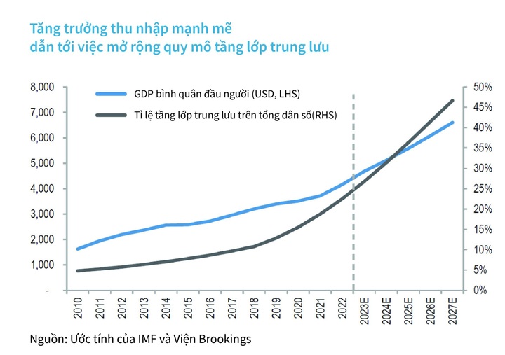Cụ thể, với dân số gần 100 triệu người, trong đó một nửa dưới 32 tuổi, Việt Nam đạt mức tăng trưởng GDP bình quân đầu người 7,1% CAGR từ năm 2017, lên đến hơn 4.000 USD vào năm 2022 - mức cao nhất trong số các nước ASEAN/EM. Mục tiêu đề ra của Chính phủ là đến năm 2030, GDP bình quân đầu người sẽ tăng lên mức 7.500 USD và chạm mốc 10.000 USD vào 5 năm sau đó.