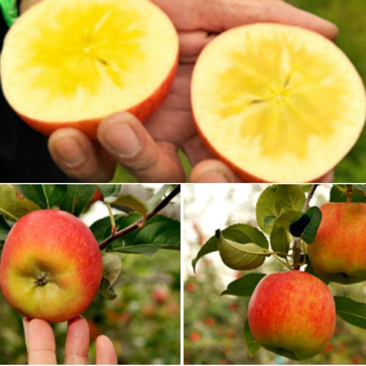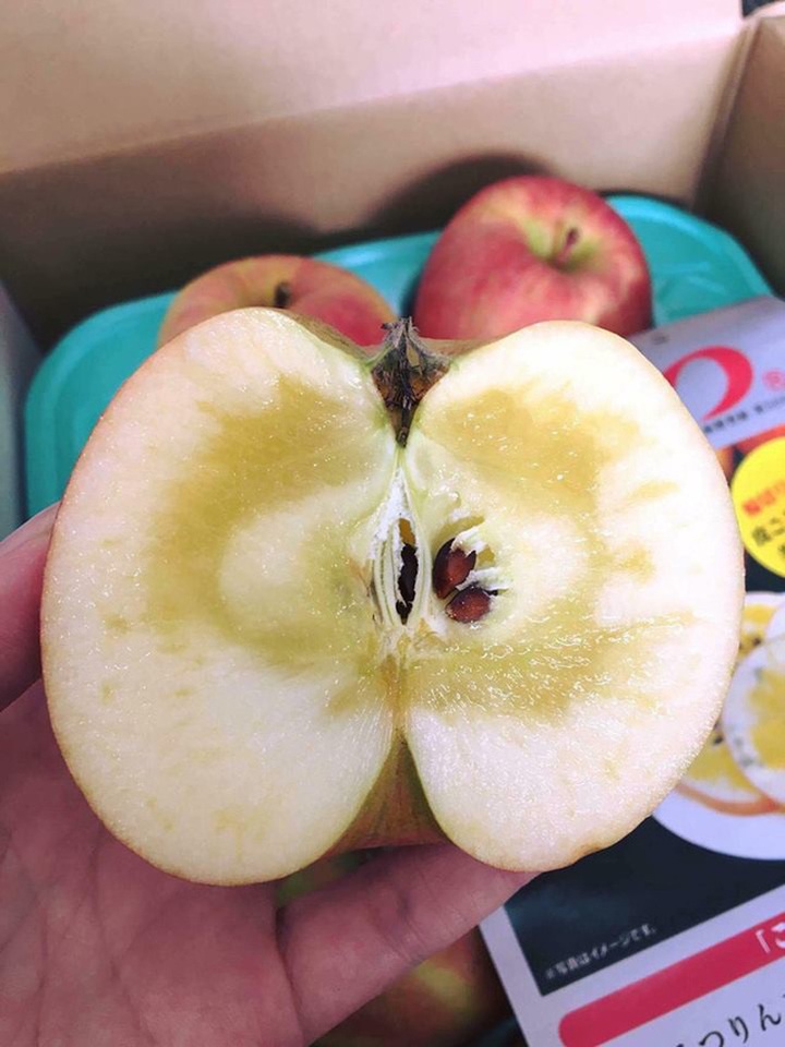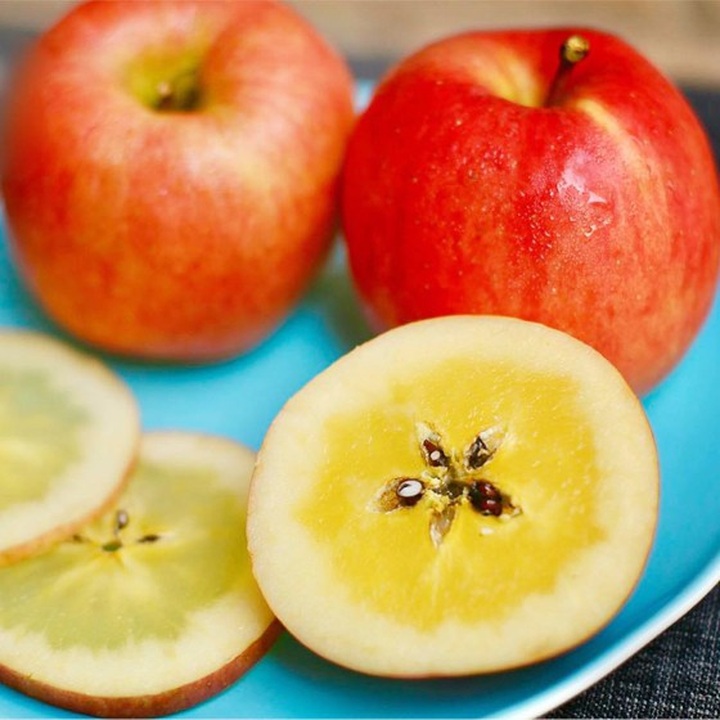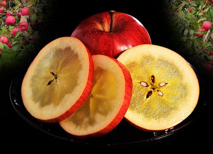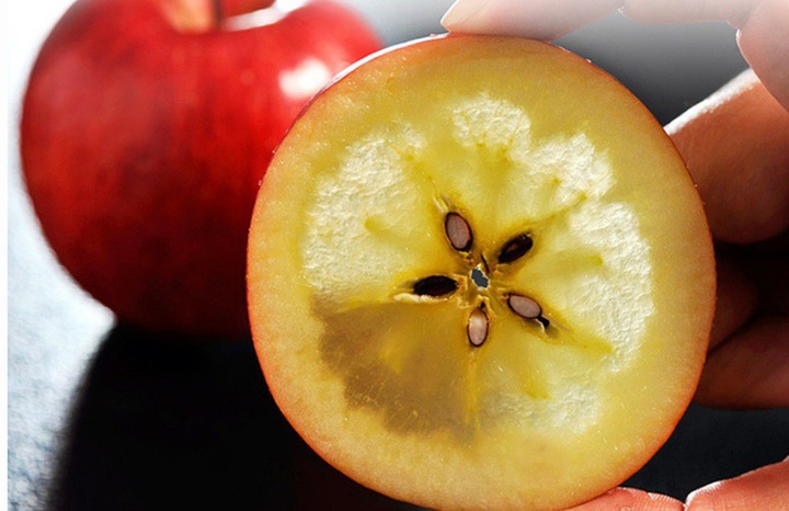 Khi bổ ra, nhìn sẽ thấy những vân như ở hình trên, nhiều người tưởng táo bị chín quá nhưng đó là điểm đặc trưng riêng của loại táo này. Cắt ngang từng lát táo sẽ thấy thịt táo rất trong và ăn rất ngon.
