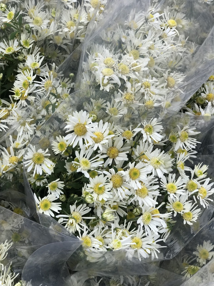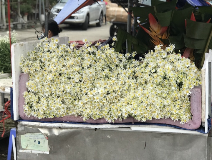 Theo chị, đây là những bó cúc đầu tiên mà dân buôn có được từ các nhà vườn ở Tây Tựu (Hà Nội). Loài hoa này có đặc điểm là chóng nở chóng tàn, mỗi vụ chỉ kéo dài trong vòng 3 tuần nên dân buôn đều tranh thủ nhập hàng sớm.
