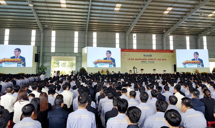 | Ông Trần Bá Dương đọc thông điệp trước hơn 8.000 cán bộ, nhân viên của Thaco |