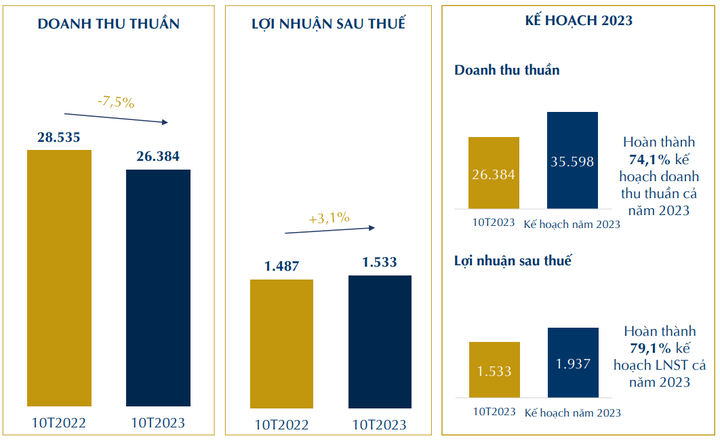 Luỹ kế 10 tháng, doanh thu thuần đạt 26.384 tỷ đồng, giảm gần 8% so với cùng kỳ còn lợi nhuận sau thuế lại tăng 3% lên 1.533 tỷ đồng. So với kế hoạch năm, PNJ đã đạt 74% chỉ tiêu doanh thu và 79% lợi nhuận.