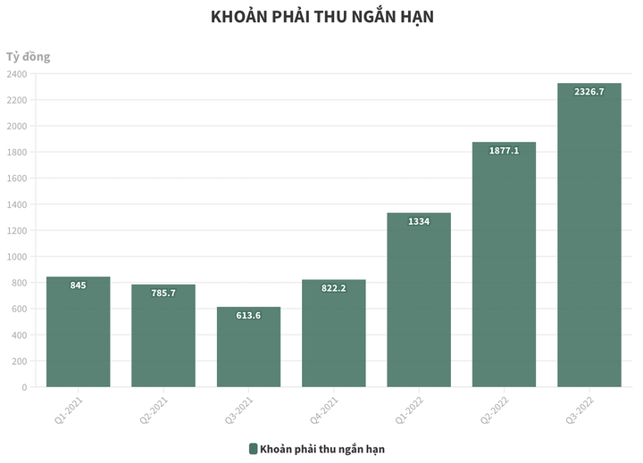 Trong kỳ, các khoản phải thu ngắn hạn tăng 64,9% so với đầu năm, tương ứng tăng thêm 915,3 tỷ đồng lên 2.326,7 tỷ đồng. Trong đó, công ty thuyết minh phải thu khác từ bên thứ ba đã tăng 886,12 tỷ đồng so với đầu năm lên 1.781,1 tỷ đồng. Mặc dù vậy, các khoản mục chi tiết không được thuyết minh.