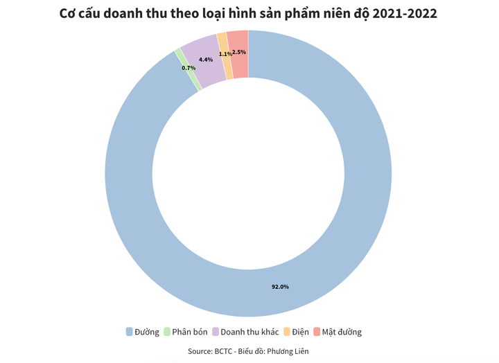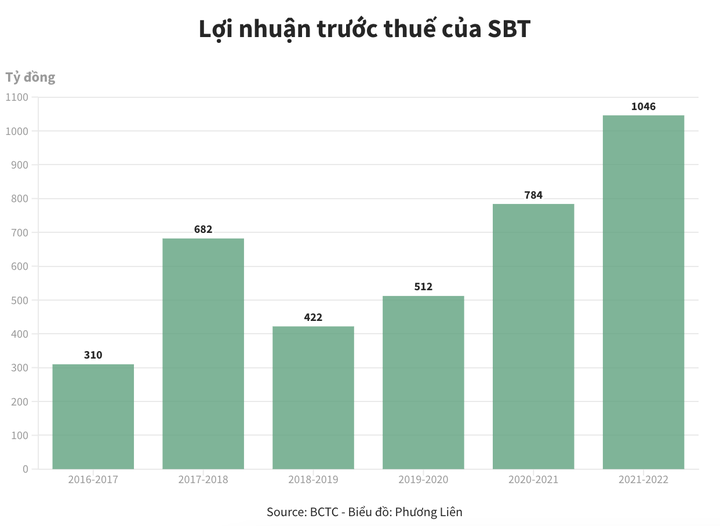 Trong niên độ 2021-2022, SBT ghi nhận doanh thu thuần đạt 18.319 tỷ đồng, tăng 23% so với cùng kỳ. Về cơ cấu doanh thu, nguồn thu chính của SBT là từ bán đường với 16.862 tỷ đồng chiếm 92% cơ cấu tổng doanh thu. Tiếp đó là doanh thu đến từ các sản phẩm mật đường (445 tỷ đồng), điện (204 tỷ đồng), phân bón (131 tỷ đồng), dịch vụ cho thuê (26 tỷ đồng) và các khoản doanh thu khác (650 tỷ đồng).