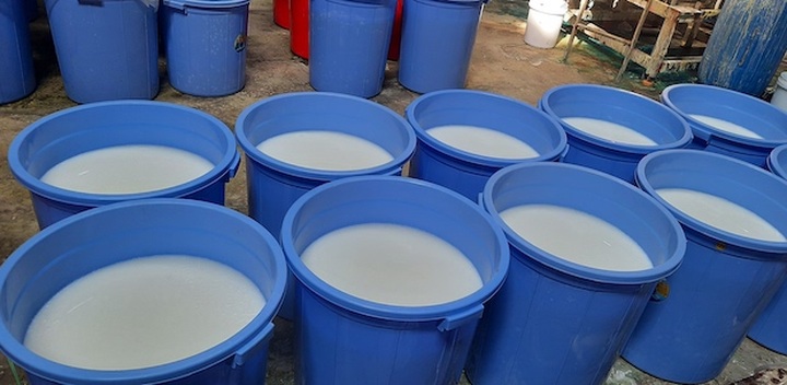 | Nguyên liệu bán thành phẩm vẫn được chứa trong các thùng phuy, thùng nhựa. |