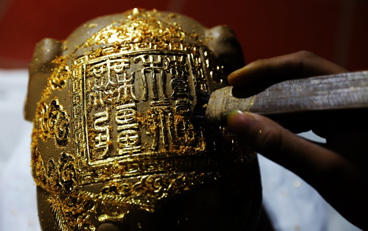 Nghệ nhân làng Kiêu Kỵ thực hiện công đoạn dát vàng 9999. Điểm đặc biệt ở mỗi sản phẩm đều có 4 chữ “Tích phúc vô cương”, cũng là 4 chữ được khắc trong ấn đền Trần linh thiêng. Vua Trần ban bốn chữ với đại ý chỉ bảo bách gia trăm họ rèn luyện nhân tâm để đời đời hưởng phúc.