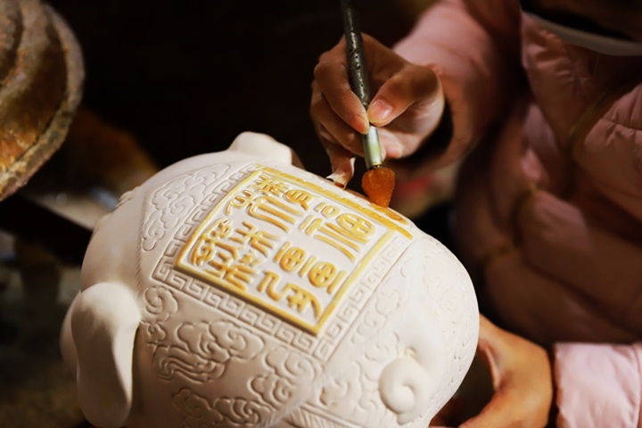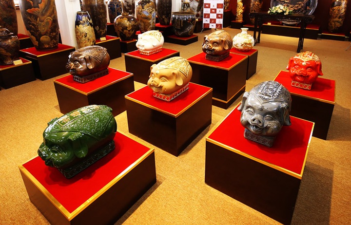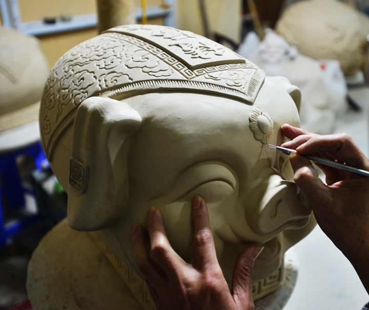 Kỳ linh Kỷ Hợi được tráng men và nung 2 lần, sau khi người thợ dùng bút sáp trau chuốt vẽ những hoa văn đặc sắc.