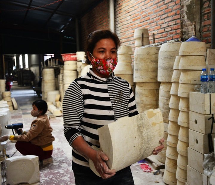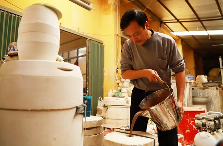 Sau khi tạo hình xong, đất khô, nghệ nhân cẩn thận tách khuôn thạch cao ra và bắt đầu tỉa trang trí.