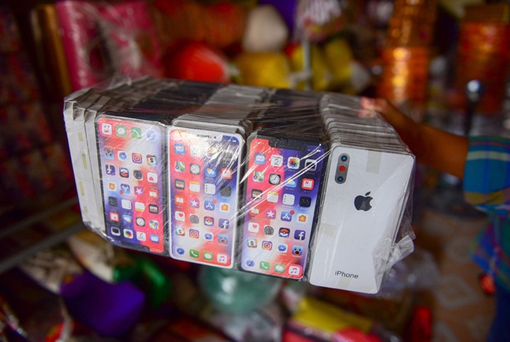 | Điện thoại iphone cũng được làm rất tinh xảo gần giống với hàng thật. Giá trị tùy vào kích thước của chiếc điện thoại, dân buôn thường gọi là vàng mã "hàng hiệu". |