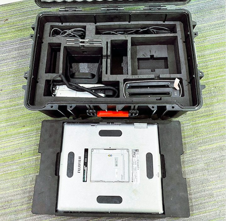 Đây là máy X-Quang cầm tay lưu động thế hệ mới nhất của hãng Fujifilm Nhật Bản, với kích thước nhỏ gọn và các chức năng hiện đại. Máy không những dễ dàng di chuyển đến từng tầng, từng phòng của các khu cách ly để tránh lây nhiễm chéo, mà còn được gắn phần mềm trí tuệ nhân tạo để giúp tầm soát, phát hiện sớm tổn thương phổi cho bệnh nhân Covid F1 tại tâm dịch Bắc Giang.