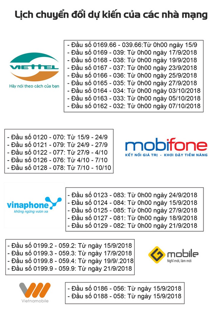 Với số thuê bao cần chuyển đổi lớn nhất lên đến 43 triệu thì Viettel cần 23 ngày (từ 15/9/2018 đến 7/10/2018) để chuyển đổi. Các nhà mạng khác như MobiFone cần 18 ngày (từ 15/9 đến 2/10/2018), VinaPhone cần 13 ngày (từ 15/9 đến 27/9/2018)....