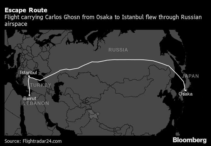 Đội nhóm hỗ trợ cho cuộc tẩu thoát của Ghosn dường như đã chọn tuyến đường hết sức hoàn hảo. Từ Osaka, máy bay đi về hướng bắc-tây bắc, tránh Hàn Quốc, nơi có hiệp ước dẫn độ với Nhật Bản và sau đó băng qua không phận Nga đến Istanbul, và cuối cùng tới thủ đô Beirut của Lebanon.