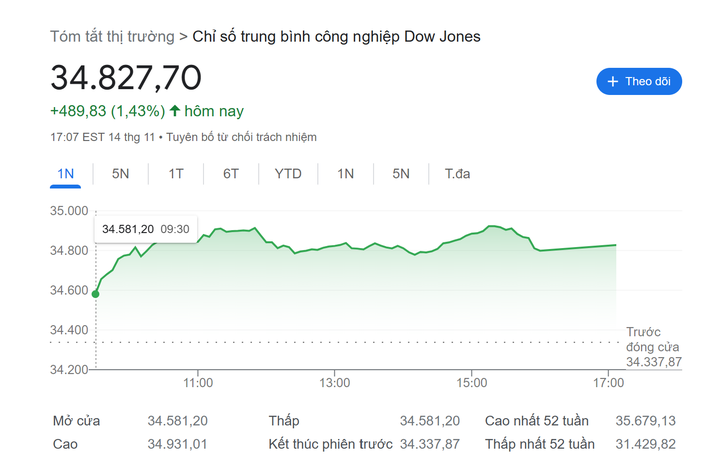 Chốt phiên giao dịch 14/11, chỉ số Dow Jones Industrial Average tăng 489,83 điểm, tương đương 1,43%, lên 34/827,7 điểm. Chỉ số S&P 500 tăng 1,91% lên 4.495,7 điểm, phiên tăng mạnh nhất kể từ tháng 4/2023. Chỉ số Nasdaq Composite dẫn đầu với mức tăng 2,37% lên 14.094,38 điểm.