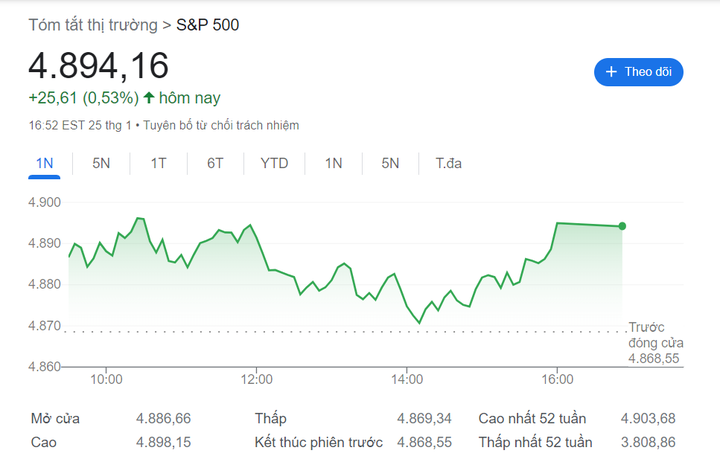 Phiên giao dịch 25/1 đồng thời đánh dấu phiên tăng thứ sáu liên tiếp của hai chỉ số S&P 500 và Nasdaq. Trong đó, chỉ số S&P 500 tiếp tục chốt phiên ở mức điểm cao nhất lịch sử. Đây là thành tích mà chỉ số này đã đạt được trong 5 phiên giao dịch gần nhất, điều chưa từng xảy ra kể từ tháng 11/2021.