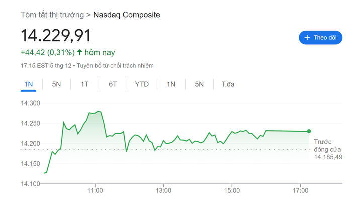 Chốt phiên giao dịch 5/12, chỉ số Dow Jones giảm 79,88 điểm, tương đương 0,22%, xuống 36.124,56 điểm. Chỉ số S&P 500 giảm 0,06% xuống 4.567,18 điểm. Ở chiều ngược lại, chỉ số Nasdaq Composite tăng 0,31% lên 14.229,91 điểm nhờ diễn biến tích cực của nhóm cổ phiếu công nghệ.