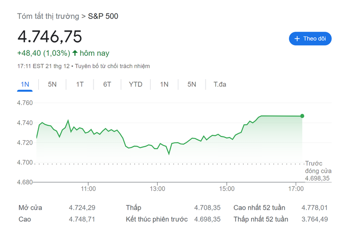 Chốt phiên giao dịch 21/12, chỉ số Dow Jones Industrial Average tăng 322,35 điểm, tương đương 0,87%, lên 37.404,35 điểm. Chỉ số Nasdaq tăng 1,26% lên 14.963,87 điểm. Trong khi đó, chỉ số S&p 500 tăng 1,03% lên 4.746.75 điểm. Hiện, chỉ số này còn cách số điểm cao nhất mọi thời đại khoảng 1%.