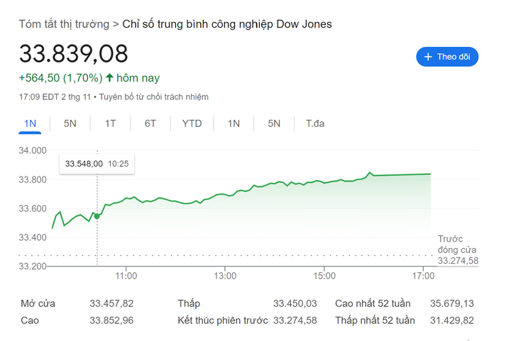 Theo đó, chỉ số Dow Jones Industrial Average tăng 564,5 điểm, tương đương 1,7%, lên 33.839,08 điểm, phiên tăng mạnh nhất kể từ tháng 6. Chỉ số S&P 500 tăng 1,89% lên 4.317,78 điểm, mạnh nhất sáu tháng trở lại đây. Đây cũng là lần đầu tiên kể từ tháng 2 chỉ số S&P 500 ghi nhận hai phiên tăng trên 1% liên tiếp. Chỉ số Nasdaq Composite cũng ghi nhận phiên giao dịch “thăng hoa” nhất kể từ tháng 7 với mức tăng 1,78% lên 13.294,19 điểm.