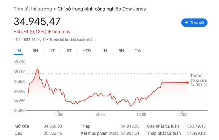 Theo đó, chỉ số này giảm 45,74 điểm, tương đương 0,13%, xuống 34.945,47 điểm, khép lại chuỗi tăng bốn phiên liên tiếp. Ở chiều ngược lại, chỉ số S&P 500 tăng 0,12% lên 4.508,24 điểm. Chỉ số Nasdaq Composite tăng 0,07% lên 14.113,67 điểm.