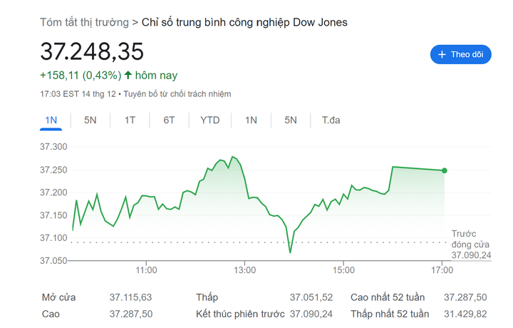 Chốt phiên giao dịch 14/12, chỉ số Dow Jones Industrial Average tăng 158,11 điểm, tương đương 0,43%, lên 37.248,35 điểm, thiết lập mức đỉnh lịch sử mới. Chỉ số S&P 500 tăng 0,26% lên 4.719,55 điểm. Chỉ số Nasdaq Composite tăng 0,19% lên 14.761,56 điểm.