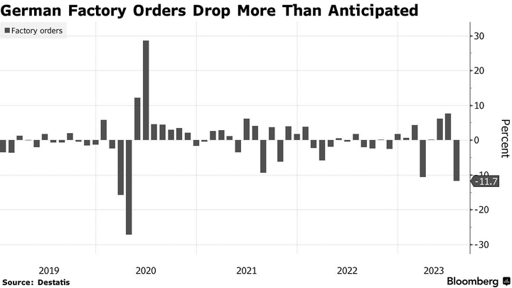 Số lượng đơn hàng sản xuất tại Đức sụt giảm với tốc độ hai chữ số trong tháng 7, tín hiệu cho thấy giai đoạn khó khăn đối với nền kinh tế số một châu Âu có thể tiếp tục lan sang quý III/2023.