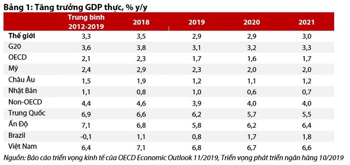 Nhật Bản và khu vực Châu Âu được kỳ vọng sẽ lần lượt tăng khoảng 0,7% và 1,2%. Trung Quốc sẽ tiếp tục dẫn dắt tăng trưởng với tốc độ tăng khoảng 5,6% giai đoạn 2020-2021. Tăng trưởng GDP của Việt Nam trong năm 2020 ước tính ở mức 6,7% yoy, giảm nhẹ so với mức dự kiến 6.8% năm 2019.
