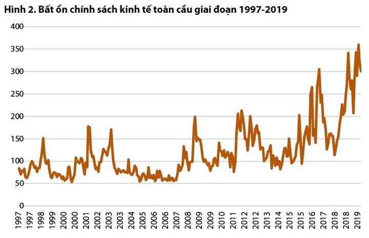 Theo hình 2, chỉ số bất ổn chính sách kinh tế (index of economic policy uncertainty) dựa trên tần suất xuất hiện của những cụm từ thể hiện sự bất ổn trong các báo cáo được nhắc đến liên tục thời gian gần đây, đạt đỉnh 341 vào tháng 12/2018, trùng thời điểm Chính phủ Mỹ đóng cửa và tiến hành đàm phán thương mại với Trung Quốc.