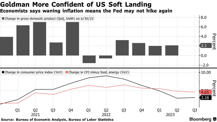 Xác suất suy thoái 15% của Goldman Sachs thấp hơn nhiều so với nhận định của đông đảo chuyên gia tham gia khảo sát của Bloomberg với 60%. Ngoài ra, ngân hàng này còn lạc quan hơn về triển vọng tăng trưởng của nền kinh tế số một thế giới với dự báo mức tăng bình quân 2% tính tới cuối năm 2024. Hatzius cho biết quyết định tăng lãi suất trong kỳ họp tháng 9 tới “không còn khả dĩ”, và động lực để Fed tiếp tục dừng tăng lãi suất trong kỳ họp hai tháng sau “gia tăng từng ngày”.
