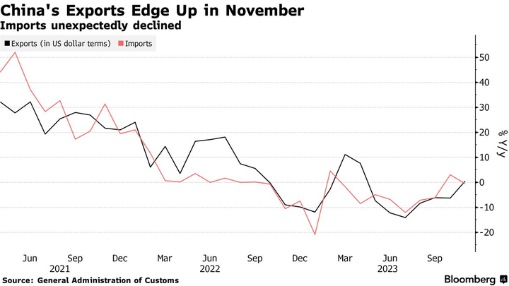 Theo dữ liệu vừa được Tổng cục Hải quan Trung Quốc công bố, giá trị xuất khẩu của quốc gia này tăng 0,5% so với tháng 11/2023 trong khi nhập khẩu giảm 0,6% trong cùng giai đoạn.