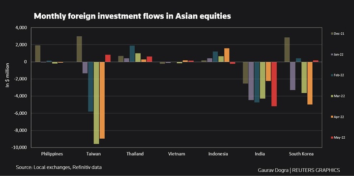 Theo những phân tích của hãng tin Reuters, nhà đầu tư nước ngoài đã rút ròng 3,69 tỷ USD khỏi thị trường chứng khoán châu Á. Dữ liệu cho thấy các đợt bán tháo diễn ra ở các nước Đông Nam Á như Thái Lan, Philippines, Indonesia cùng những nơi khác như Đài Loan, Hàn Quốc trong 5 tháng đầu năm nay.