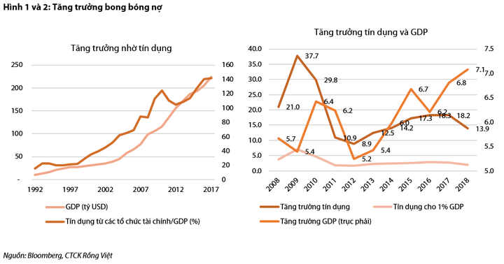 Theo nhận định của VDSC, trong thập kỷ tới, chúng ta sẽ chứng kiến sự tăng cường đáng kể của hệ thống tài chính tại Việt Nam. Hiện tại ngoài trừ Trung Quốc, Việt Nam là quốc gia duy nhất trong khu vực có tín dụng ngân hàng vượt quá quy mô thị trường trái phiếu và cổ phiếu. Tín dụng từ khối tài chính đã tăng từ mức 21% GDP trong năm 1997 lên 142% sau 20 năm. "Đây là tỷ lệ tăng trưởng không bền vững đối với Việt Nam" - báo cáo của VDSC đánh giá.