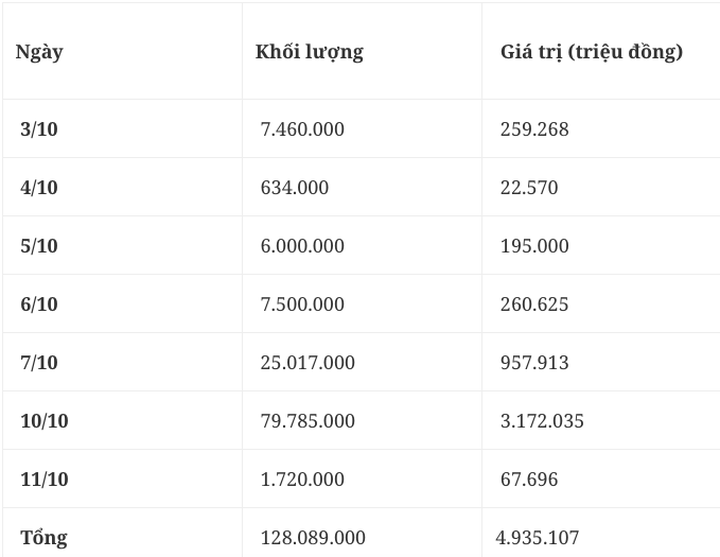 | Giao dịch thỏa thuận mã EIB từ đầu tháng 10 đến nay (Thống kê: Thảo Thu). |