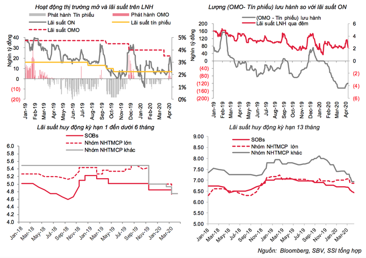 NHNN ước tính có khoảng 2 triệu tỷ dư nợ bị ảnh hưởng bởi dịch Covid-19, tương đương 23% tổng dư nợ. Để hỗ trợ các NHTM thực hiện định hướng giảm lãi suất, SSI Research cho rằng, rất có thể NHNN sẽ giảm tiếp lãi suất điều hành trong thời gian tới.