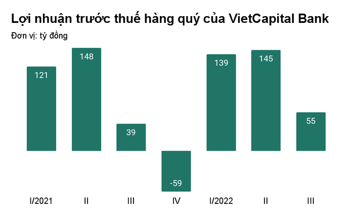 Tuy nhiên, với hoạt động mua bán chứng khoán đầu tư, VietCapital Bank lỗ 8 tỷ đồng trong 3 tháng qua. Quý III năm trước, nghiệp vụ này mang lại lợi nhuận đến hơn 60 tỷ đồng cho ngân hàng.