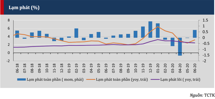 Theo cập nhật tại báo cáo này, chỉ số giá tiêu dùng tháng 6/2020 đã tăng 3,17% so với cùng kỳ và tăng 0,66% so với tháng trước- mức tăng cao nhất trong giai đoạn 2016-2020 do 2 đợt điều chỉnh giá xăng dầu vào cuối tháng Năm và tháng Sáu làm giá nhóm hàng giao thông tăng 6,05% so với tháng 5.