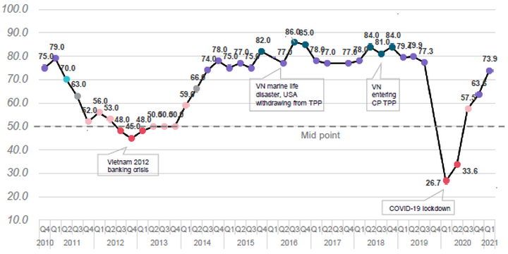 Đây là số điểm cao nhất được ghi nhận kể từ quý 3/2019, trước khi đại dịch Covid-19 tấn công hệ thống thương mại và đầu tư toàn cầu. Kết quả khảo sát cho thấy sự lạc quan về môi trường kinh doanh tiếp tục được duy trì, tăng 47 điểm phần trăm trong 12 tháng qua.