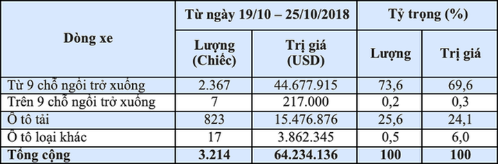 Theo số liệu thống kê sơ bộ của Tổng cục Hải quan, trong tuần qua (từ ngày 19/10/2018 đến ngày 25/10/2018) số lượng ô tô nguyên chiếc các loại đăng ký tờ khai hải quan nhập khẩu đạt 3.214 chiếc, tương ứng đạt 64,2 triệu USD, tăng tới 64% so với tuần trước (đạt 1.957 chiếc với tổng trị giá là 46,7 triệu USD).
